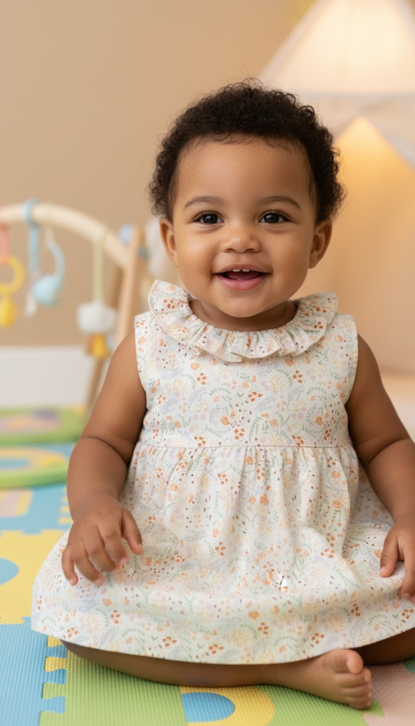 Finest fashion for babies, bespoke, gathered collar dress back buttoned and bombacha diaper covers.