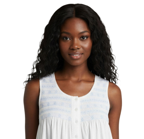 Long gown 48" sleeveless, smocked and blue hand embroidered.