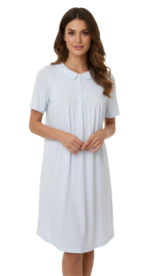 Short gown 38", long sleeved, smocked and hand embroidery.