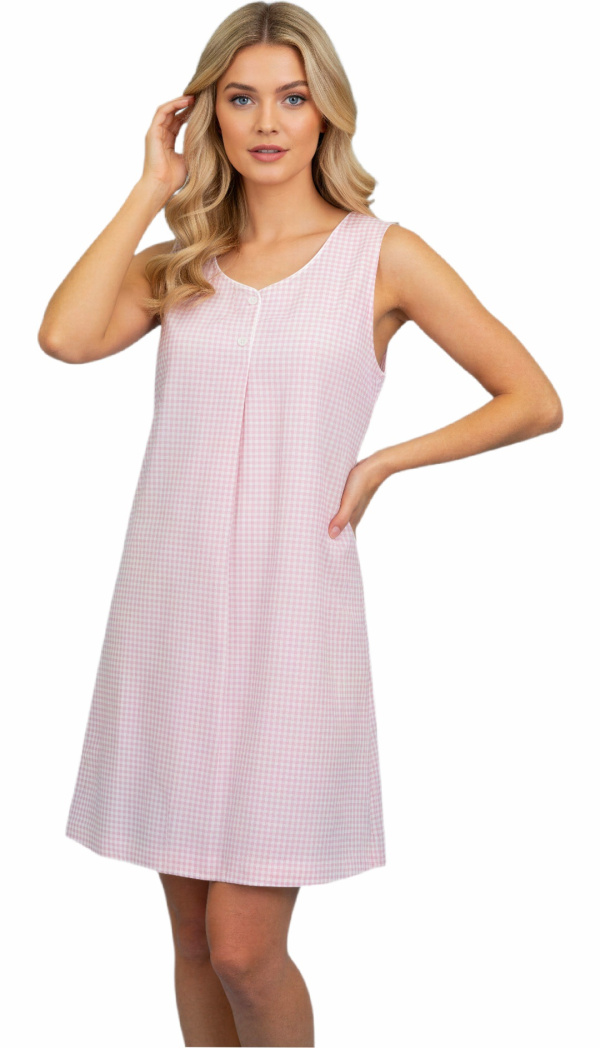 Coral checks short robe 36", white cotton piping, patch pockets.