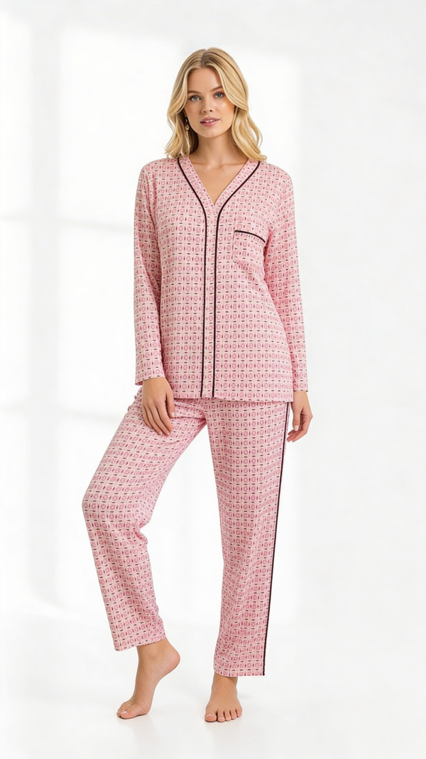 Short gown, short sleeved, soft black print on pink ground, it is slim fit.
